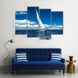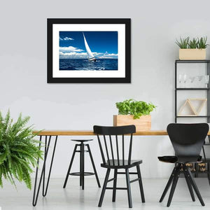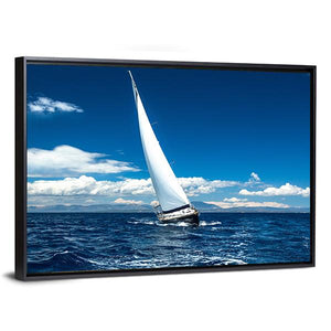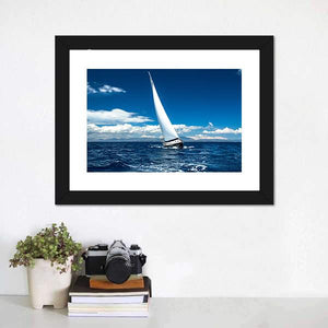 This striking canvas art features a sailboat gliding across serene blue ocean waves under a clear sky. The composition highlights distant mountains and fluffy clouds, evoking a calm and adventurous atmosphere, perfect for enhancing any room.