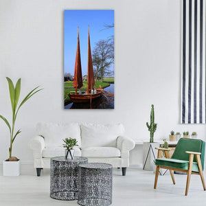 Traditional Wooden Sailboat by Flowered Canal Vertical Canvas Wall Art