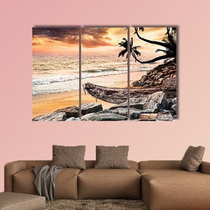 Tropical Sunset Beach with Wrecked Boat Canvas Wall Art
