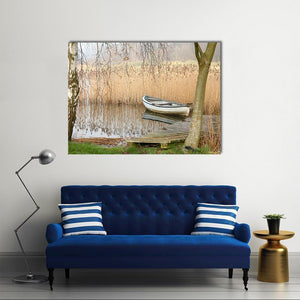 This serene landscape features a white rowboat docked on a wooden pier in Denmark. Surrounded by tall dry reeds and bare tree branches, the artwork captures a calm and peaceful mood. It’s a lovely addition for those looking to enhance their nature-themed décor.
