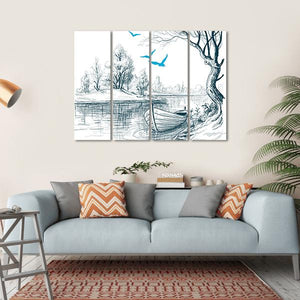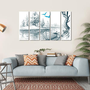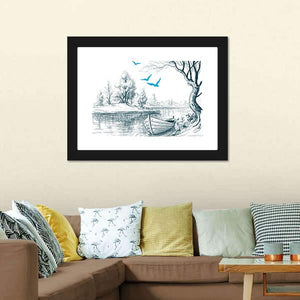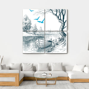 This serene canvas captures a peaceful scene of a rowboat on a calm lake surrounded by sketchy trees and birds in flight. The hand-drawn style and gentle palette of blues, greens, and whites evoke a natural tranquility, making it a perfect addition to any art collection or room decor.