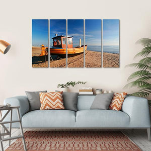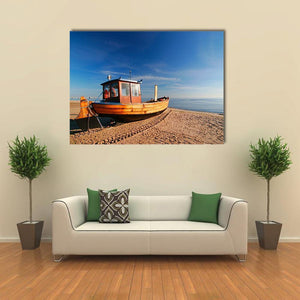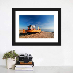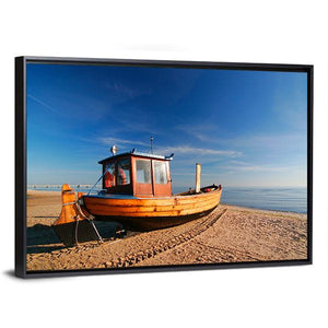 Experience the calming essence of a beach scene with this canvas art featuring a boat nestled in soft sand. The serene palette of blue, orange, and tan evokes the peacefulness of the ocean and sky, making it a perfect addition to your nature-inspired decor.