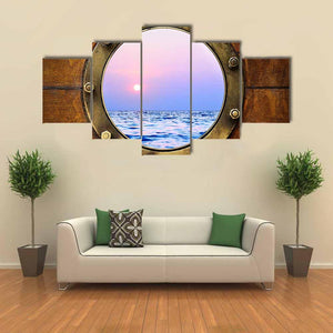 This artwork features a serene view through a circular porthole, showcasing the tranquil ocean at sunset. The soft blend of blue, pink, and orange hues invites a peaceful atmosphere, making it an ideal addition to rustic or vintage decor.