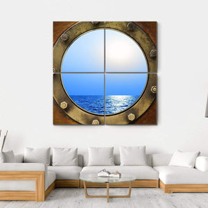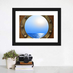 This canvas art offers a serene ocean view through a porthole, capturing the gentle sunlight reflecting on the water. The calming blend of blue, white, and brown creates a peaceful atmosphere, perfect for enhancing any living space.