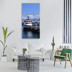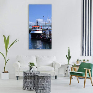 Boats In Great Britain shows two boats docked on calm, sunlit water in a realistic landscape of Great Britain. Soft blues, whites and a touch of orange give the scene a sunny, tranquil feel that works well in modern, nautical or nature-inspired rooms.