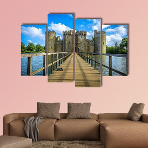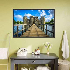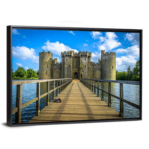 Bodiam Castle England Canvas Wall Art depicts a stone castle with turrets, a wooden bridge, and calm water. The realistic landscape uses blue, grey, brown, and green tones with leading lines and depth to create a historic, majestic, and serene atmosphere. Works well in living rooms, studies, or hallways.