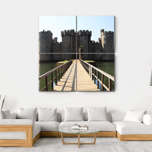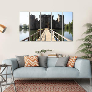 This canvas wall art beautifully captures the historic Bodiam Castle, featuring its majestic towers reflected by the serene moat. The clear blue sky and the leading lines of the wooden bridge invite you to explore this enchanting scene.