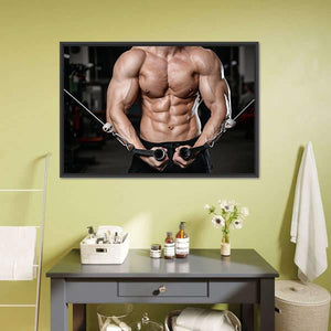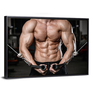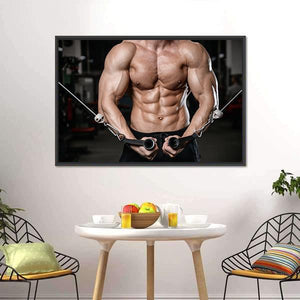 This canvas features a close-up of a bodybuilder performing a cable fly, with sweaty skin and defined chest and abdominal muscles. The photorealistic image carries an intense, powerful athletic mood and works well in a home gym or modern living room.