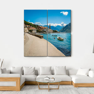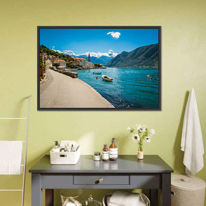 This canvas wall art depicts the serene beauty of Boka Kotor Bay in Montenegro, featuring small boats gently bobbing in the water and mountains in the distance. With a bright and picturesque palette of blues, greens, and earthy browns, it brings a touch of nature's tranquility into your space.