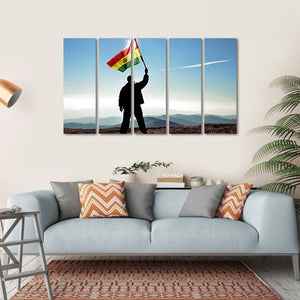 This canvas art features a silhouette of a person holding the Bolivian flag against a majestic mountain range. An inspiring blend of bold colors like blue, green, and red creates a victorious and serene atmosphere.