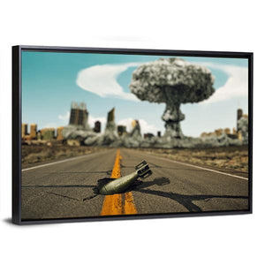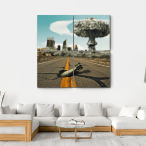 This canvas art depicts an intense scene of a nuclear explosion above a cracked road in a desolate, ruined city. The dramatic palette of gray, blue, and yellow evokes an ominous, apocalyptic atmosphere, making it a striking addition to any wall decor.