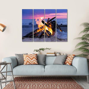 This canvas art captures a serene beach bonfire at sunset, where warmth meets tranquility. The rich palette of orange, purple, and blue reflects the peaceful evening sky, making it a lovely addition to any nature-inspired décor.