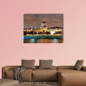 This canvas art features a serene depiction of Bonsecours Market in Canada, highlighting its iconic dome against a tranquil waterfront. Illuminated at night, the colors of blue, gold, and brown create a calming atmosphere, perfect for enhancing your room's décor.
