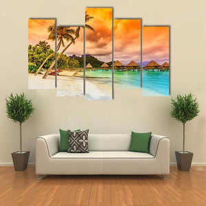 This artwork captures the serene beauty of Bora Bora, featuring a tropical beach with overwater bungalows and palm trees against a vibrant sunset sky. Its photorealistic style and rich palette of orange, blue, and green invite a calming atmosphere to any space.