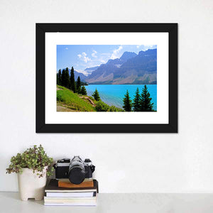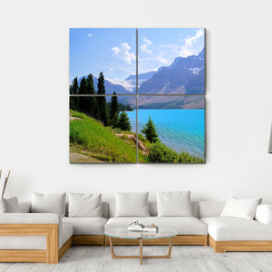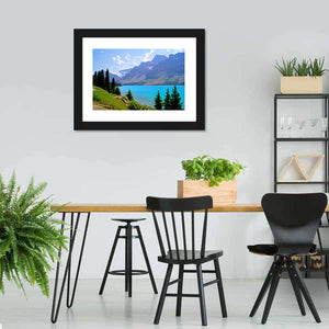 This canvas features a stunning mountain lake surrounded by snow-capped peaks and lush pine trees. The scene is peaceful and majestic, highlighting clear turquoise water and fluffy white clouds, perfect for any nature lover's decor.