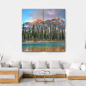 This canvas captures the serene beauty of Bow Lake at sunrise, showcasing majestic snow-capped mountains and lush pine trees. The natural palette of blue, green, and orange creates a calming atmosphere, perfect for enhancing your living space.