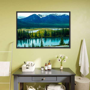 This panoramic canvas captures the Bow River winding through a valley of dense evergreens, shown in calming blues, greens, browns, and white. Drawn from Banff National Park, the scene feels serene and peaceful with gentle reflections on the water. It suits modern or nature-focused room decor.