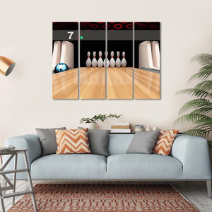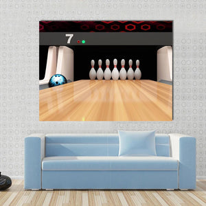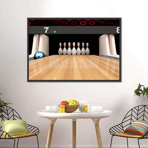 This canvas art captures the vibrant energy of a bowling alley, featuring dynamic bowling pins and a blue bowling ball. The mix of browns, blacks, and bright accents creates a focused and game-ready atmosphere that could enhance any recreational space.