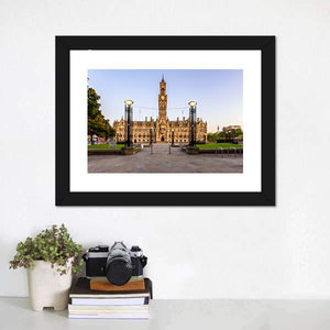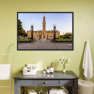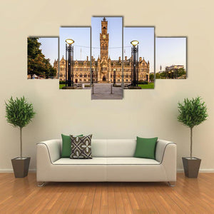 This canvas wall art captures the grand architecture of Bradford Town Hall, featuring a tall clock tower and ornate details. With its bright palette of tan, blue, and green, it adds a historic touch to any space.
