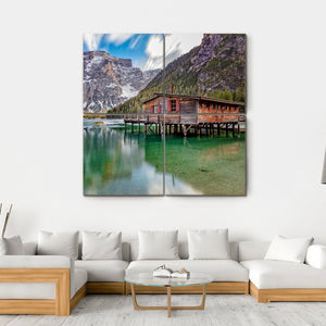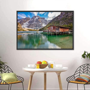 Experience the serene beauty of Braies Lake nestled in the Italian Alps. This captivating artwork features a tranquil scene with snow-capped mountains, a wooden cabin on stilts, and reflections shimmering on the water, inviting a peaceful atmosphere into your space.