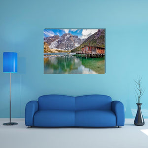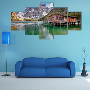 Braies Lake on the Italian Alps presents a serene, majestic mountain lake with a wooden stilt cabin and snow-capped peaks. Wispy clouds streak the sky while blues, greens, browns and white build depth in a realistic landscape. Suited to modern or nature-themed rooms.