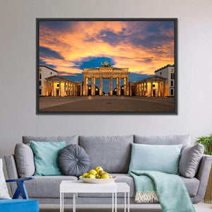 Brandenburg Gate in Germany is presented in a majestic, dramatic cityscape rendered in realism, with the quadriga statue clearly visible. Warm golden and orange sunset tones blend with blue-gray sky to emphasize the landmark’s symmetry. This canvas print suits modern or travel-inspired rooms that welcome bold architectural art.