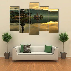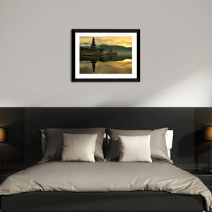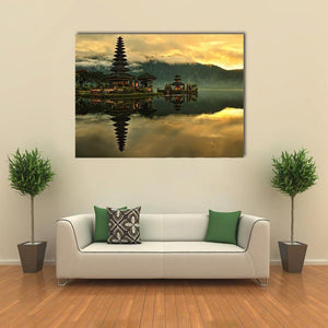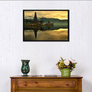 This serene canvas art features the tranquil Bratan Water Temple surrounded by lush mountains and a calm lake. The photorealistic style captures the reflection of the multi-tiered temple, creating a peaceful atmosphere for your space.