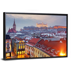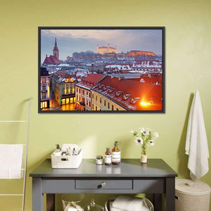 This captivating canvas art features the stunning skyline of Bratislava, showcasing its historic castle and church against a snowy backdrop. The winter scene is enhanced by the glow of illuminated windows and charming red tiled roofs, creating a warm atmosphere in any space.
