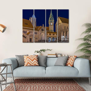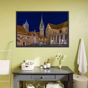 This cityscape artwork captures the tranquil charm of Braunschweig, showcasing elegant buildings and a clock tower beneath a serene evening sky. Its harmonious palette of blue, beige, and brown complements any space, adding a touch of historic beauty.