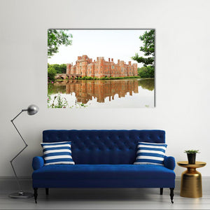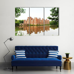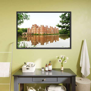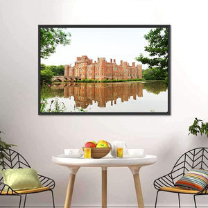 This serene canvas features a beautiful castle reflected in gentle waters, flanked by lush trees and an elegant arched bridge. Its realistic style and harmonious palette of red, green, brown, and white make it an engaging addition to any space.