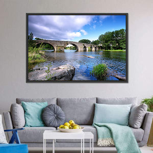 Bridge And River In Spain presents a peaceful landscape focused on a stone arched bridge crossing a rocky riverbed, with trees and dramatic clouds above. Its blue, green, gray and brown palette and rustic feel bring a calm, natural atmosphere that suits nature-inspired rooms or a home's living area.