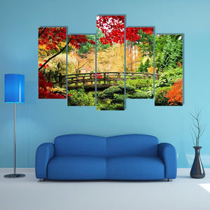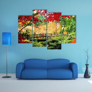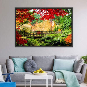 Bridge In Garden Canvas Wall Art shows a wooden bridge in a garden, surrounded by trees and vibrant autumn leaves. The realistic landscape uses warm reds, greens, yellows and browns and a clear sense of depth to create a serene, peaceful atmosphere. It suits modern, nature-minded home interiors.