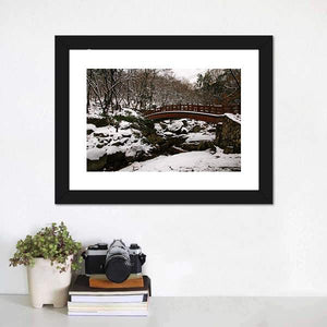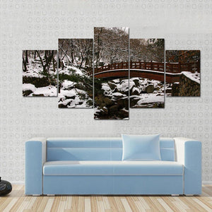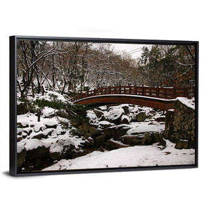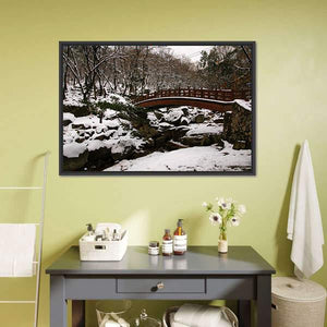 This canvas art captures a serene winter landscape featuring a Japanese-style wooden bridge surrounded by snow-covered rocks and trees. The tranquil palette of whites and browns evokes a peaceful, cold atmosphere, making it a beautiful addition to any nature-inspired decor.