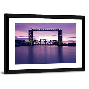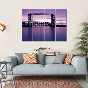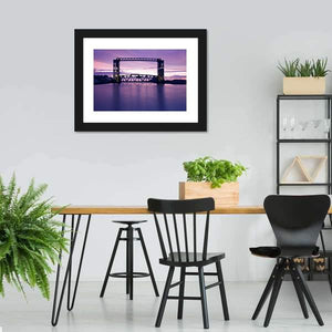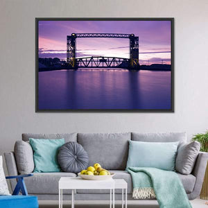 This captivating canvas art features a serene bridge surrounded by gentle waters and a twilight sky. The modern design, with its calming palette of purple, pink, gray, and blue, creates a tranquil atmosphere perfect for any room.