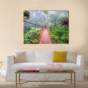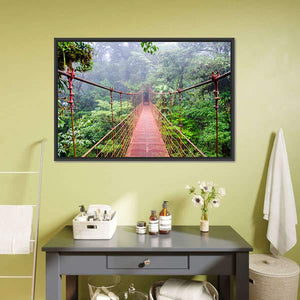 This captivating piece features a vibrant suspension bridge enveloped by a lush rainforest. The atmosphere is mysterious and serene, enhanced by fog and rich foliage in shades of green, brown, and gray.