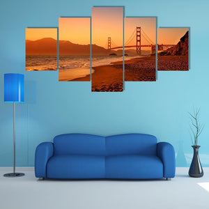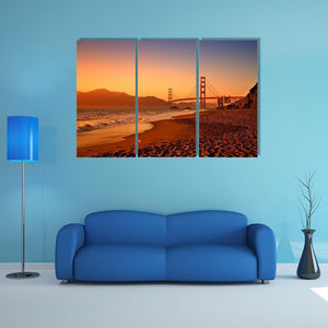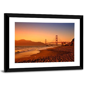 This photorealistic landscape captures the Golden Gate Bridge from Baker Beach at sunset, with a sandy shore, gentle waves, and warm orange and blue tones. The rule-of-thirds composition and tranquil, warm mood make it a calm focal point for modern or coastal-themed rooms.
