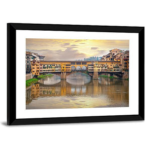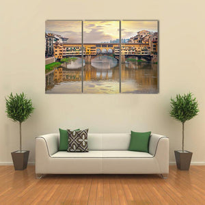An eye-level, wide view of the Ponte Vecchio spanning the Arno River in Florence at sunset. Warm yellow, orange and brown tones with a blue-gray sky create a serene, historic mood, while the bridge’s shops and their reflections in the water give a travel-photography realism. Suits living rooms, entryways, or travel-themed décor.
