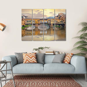 Capture the beauty of Florence with this canvas art depicting the Ponte Vecchio bridge over the serene Arno River. The warm colors and golden hour lighting evoke a sense of history and tranquility.