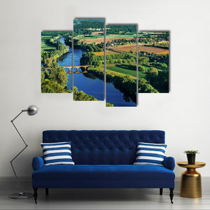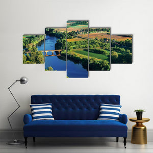 Bridge Over Dordogne River Canvas Art shows a photographic, aerial view of a stone arch bridge spanning a meandering river through cultivated fields, lush trees and distant rolling hills. The scene feels serene and idyllic, with a blue-green palette and strong leading lines that create depth. It suits modern or country-style living rooms and hallways as calming, nature-inspired wall decor.