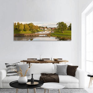 Bridge In Old City Norway shows a peaceful riverside scene with a wooden bridge, lined trees, distant buildings and calm water reflections. The photographic, panoramic composition uses greens, browns and blues to create a serene, natural mood that suits modern or nature-inspired rooms.