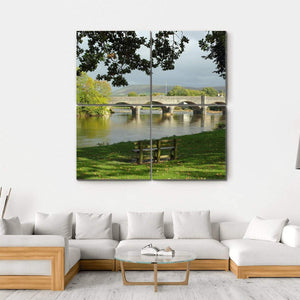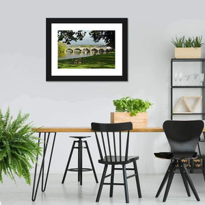 This canvas art depicts a serene scene featuring a stone bridge over the River Wye, surrounded by lush grass and trees. The peaceful atmosphere and realistic style invite a touch of nature into your space, making it an ideal choice for any room seeking a calm ambiance.