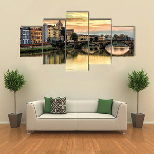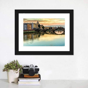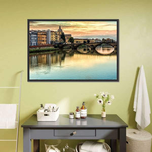 This landscape canvas shows a river with a five-arched bridge, nearby buildings and a domed structure rendered in a realistic, vibrant style. Warm blues, oranges and yellows reflect across the water, creating a serene, picturesque sunset mood that fits modern room decor.