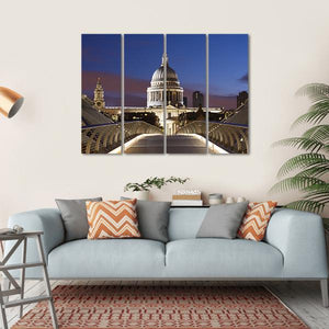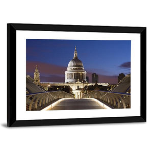 This canvas artwork captures the beauty of London's Millennium Bridge alongside the iconic St Paul's Cathedral. The serene evening atmosphere, highlighted by blue and gold hues, invites a sense of calm into any space.