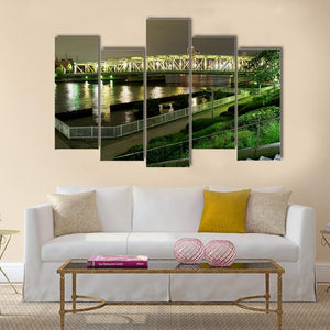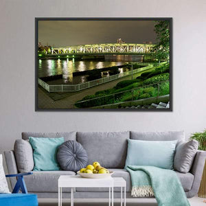 This photorealistic canvas depicts a riverside promenade and a geometric bridge at night in Japan, with illuminated architecture and lights reflecting on the water. Grays with yellow and green accents give the scene a tranquil, urban glow. It fits modern living rooms, entryways, or other city-inspired spaces.