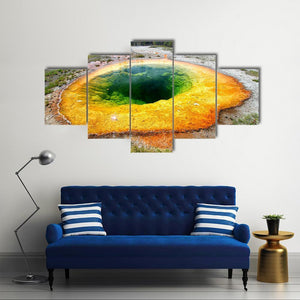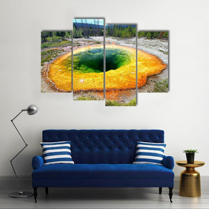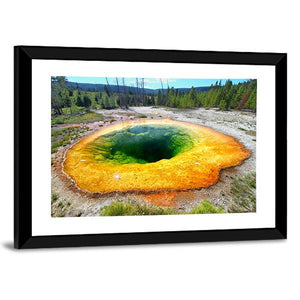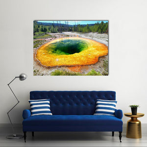 This canvas art captures the serene beauty of a geothermal pool at Yellowstone. Featuring vibrant mineral deposits and a clear sky, it brings a natural and calming atmosphere to any space.