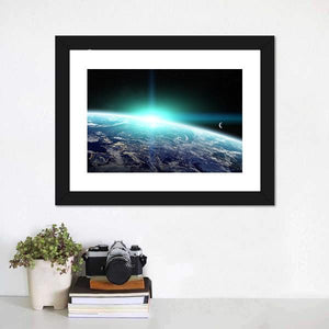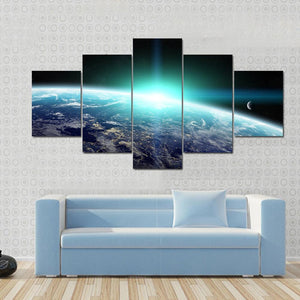 This modern landscape artwork depicts planet Earth at sunrise, showcasing its glowing atmosphere and visible city lights. The crescent moon adds a touch of wonder, creating an awe-inspiring scene that enhances any room's decor.