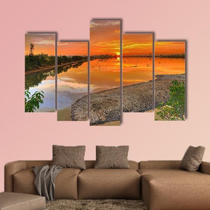 Sunrise Across A River India presents a wide riverscape with the sun on the horizon, soft clouds, and trees along a rocky shoreline reflected on calm water. Warm orange and gold tones create a peaceful, serene mood that suits modern or nature-inspired rooms like living rooms and bedrooms.