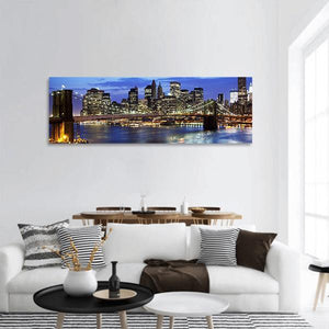 This panoramic canvas captures the Brooklyn Bridge and Manhattan skyline at night in a wide-angle cityscape, with city lights and water reflections. Rendered in blue, black, yellow and white, the modern composition offers a vibrant, energetic urban mood that suits modern or urban interiors.