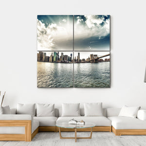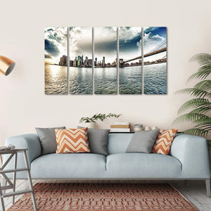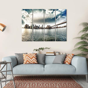 This canvas wall art captures a stunning city skyline of Brooklyn against a backdrop of dramatic stormy clouds and sun rays reflecting off the water. The modern, panoramic design features a blend of blue and grey tones, evoking a sense of awe and the vibrant energy of New York.