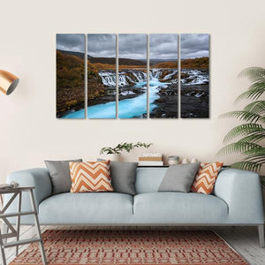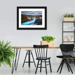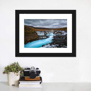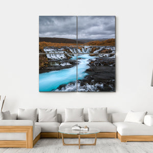 This canvas features the stunning Bruarfossus waterfall in Iceland, capturing its beautiful flow amidst rugged rocks and mountains. The palette of blue, brown, and gray evokes a serene yet dramatic atmosphere, making it a striking piece for any art lover.